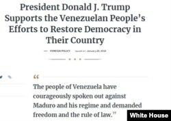 • El 23 de enero el presidente Donald Trump reconoció oficialmente al presidente de la Asamblea Nacional de Venezuela, Juan Guiadó, como presidente interino de Venezuela.