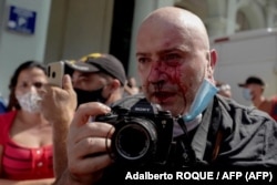 El fotógrafo de AP, el español Ramón Espinosa, aparece con heridas en la cara mientras cubría una manifestación contra el presidente cubano Miguel Díaz-Canel en La Habana, el 11 de julio de 2021. Miles de cubanos participaron en raras protestas el domingo contra el gobierno comunista, marchando a través de un pueblo coreando "Abajo la dictadura" y "Queremos la libertad".