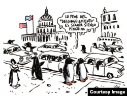 En una de las caricaturas todos los personajes son pingüinos que pasean frente al Capitolio de La Habana y uno dice: “Lo peor del descongelamiento es seguir siendo pingüino”.