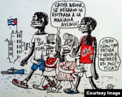 “Me contactó entonces con un caricaturista chileno, que me recibió acá”, cuenta el dibujante cubano. “Hicimos la famosa carta de invitación; como yo trabajaba en Juventud Rebelde no me fue difícil hacer los trámites, pero salí con pasaporte oficial, porque sabían que me iba a quedar. Averigüé y me dijeron que cuando llegara fuera a la Embajada y cambiara el pasaporte. Cuando fui el Cónsul me dijo: “Pero cómo tú, siendo tan joven, te recomiendo que vuelvas y recapacites…” Le dije: “Compadre, ya estoy acá. No tengo más dinero para estar volviendo”. Y así fue”.